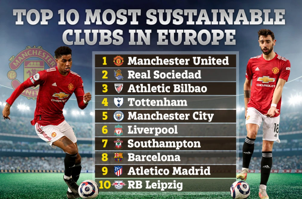 Theo sau MU trong Top 10 CLB bền vững nhất châu Âu lần lượt là Real Sociedad, Athletic Bilbao, Tottenham, Manchester City, Liverpool, Southampton, Barcelona, Atletico Madrid và RB Leipzig.
