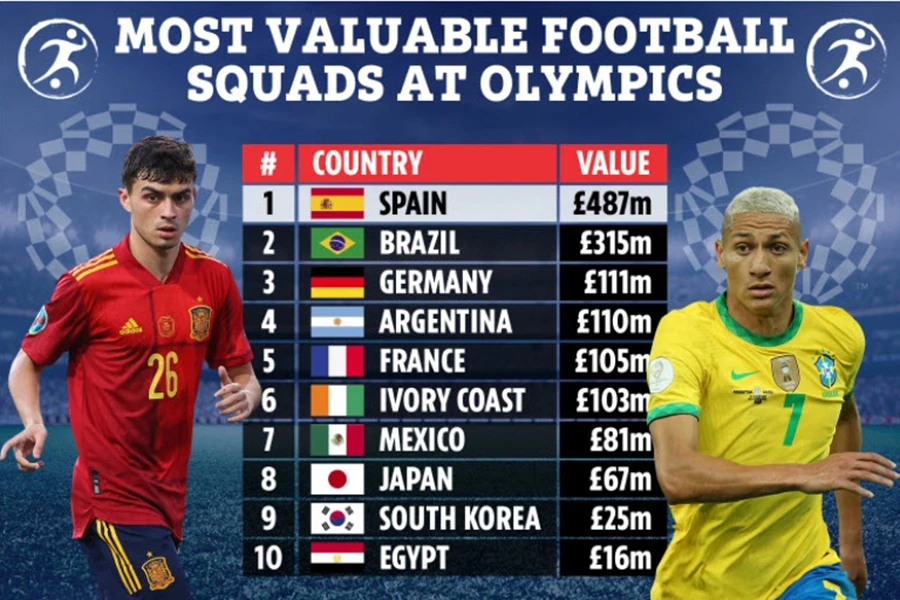 4 đội Olympic còn lại nằm trong Top 10 là Mexico (81 triệu bảng Anh), chủ nhà Nhật Bản (67 triệu bảng Anh), Hàn Quốc (25 triệu bảng Anh) và Ai Cập không có Mo Salah (16 triệu bảng Anh).