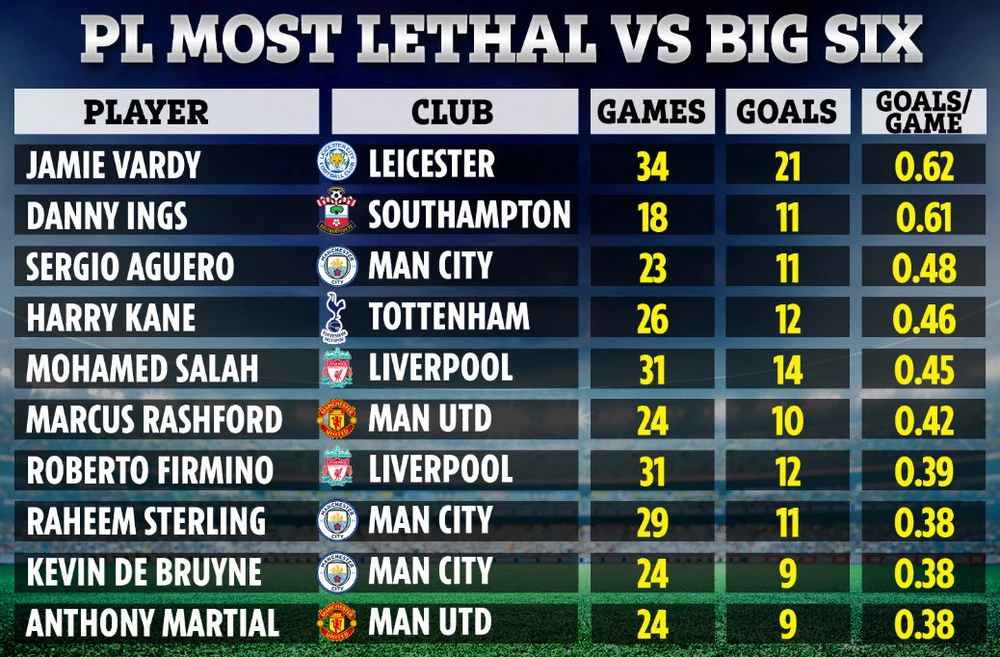 Theo thống kê, trong 34 trận đối đấu với các CLB thuộc nhóm Big six Premier League gồm Manchester United, Manchester City, Liverpool, Arsenal, Chelsea và Tottenham, tiền đạo của Leicester City Jamie Vardy đã ghi 21 bàn thắng.