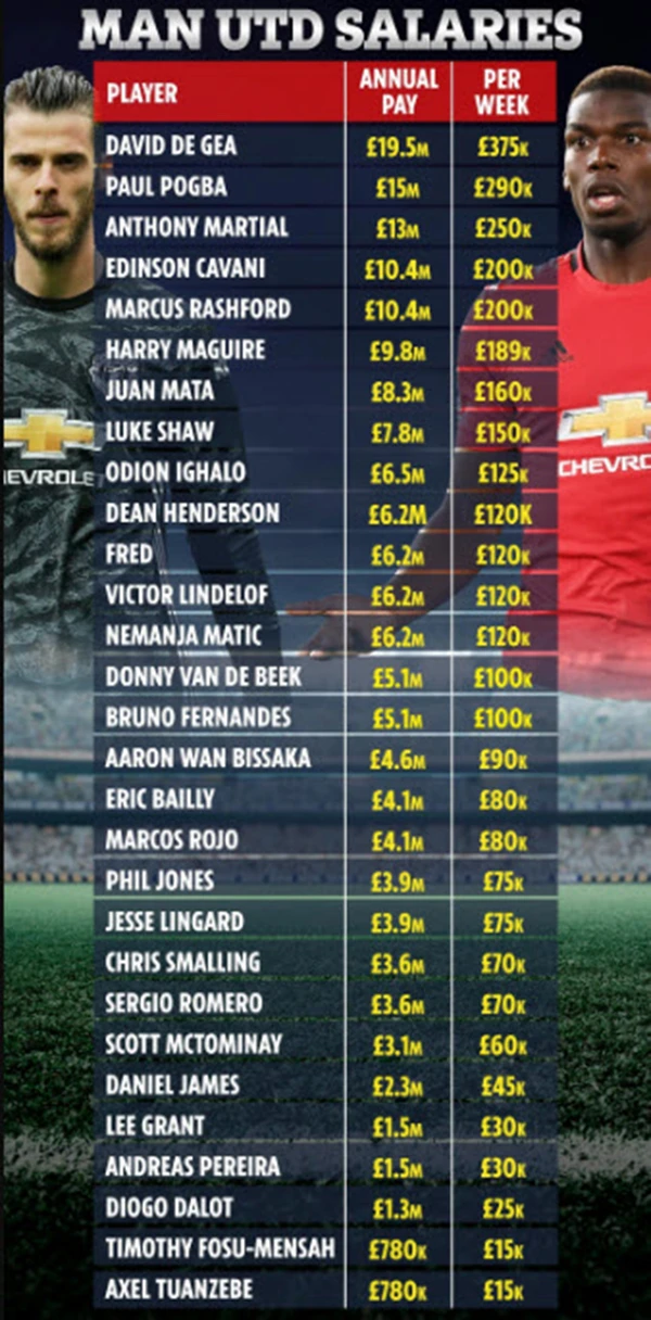 Đáng chú ý, ngôi sao được xem là sáng nhất và thi đấu hay nhất ở MU hiện tại Bruno Fernandes chỉ hưởng mức lương 100.000 bảng Anh/tuần. Trong số các cầu thủ MU lương từ 100.000 bảng Anh/tuần trở lên còn có Dean Henderson, Fred, Victor Lindelof, Nemanja Matic và tân binh Donny Van De Beek.