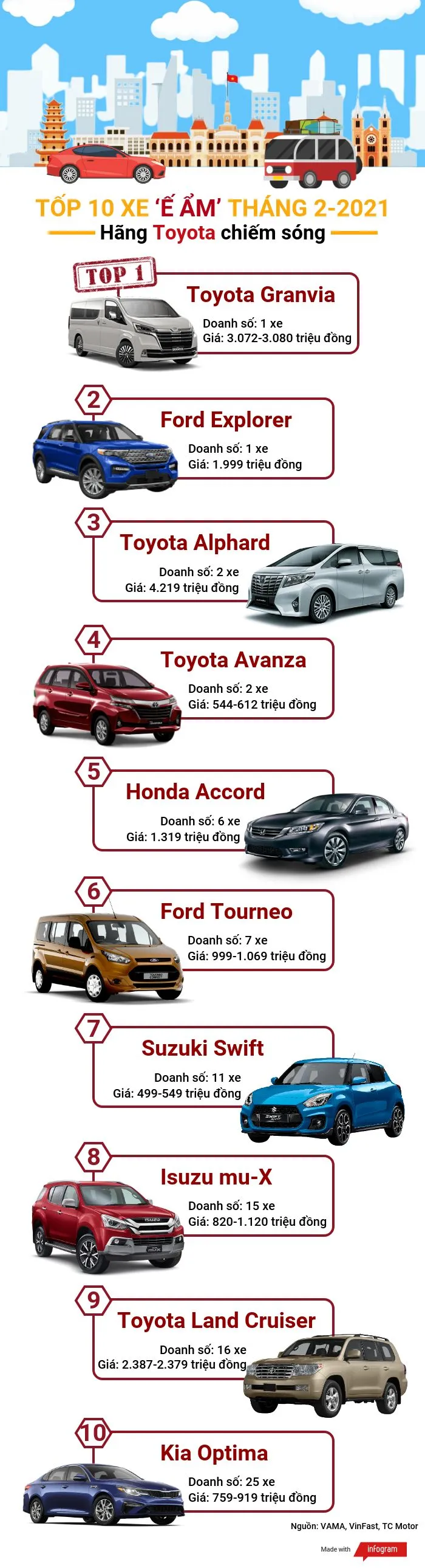 Tốp 10 xe ‘ế ẩm’ tháng 2: hãng Toyota chiếm sóng