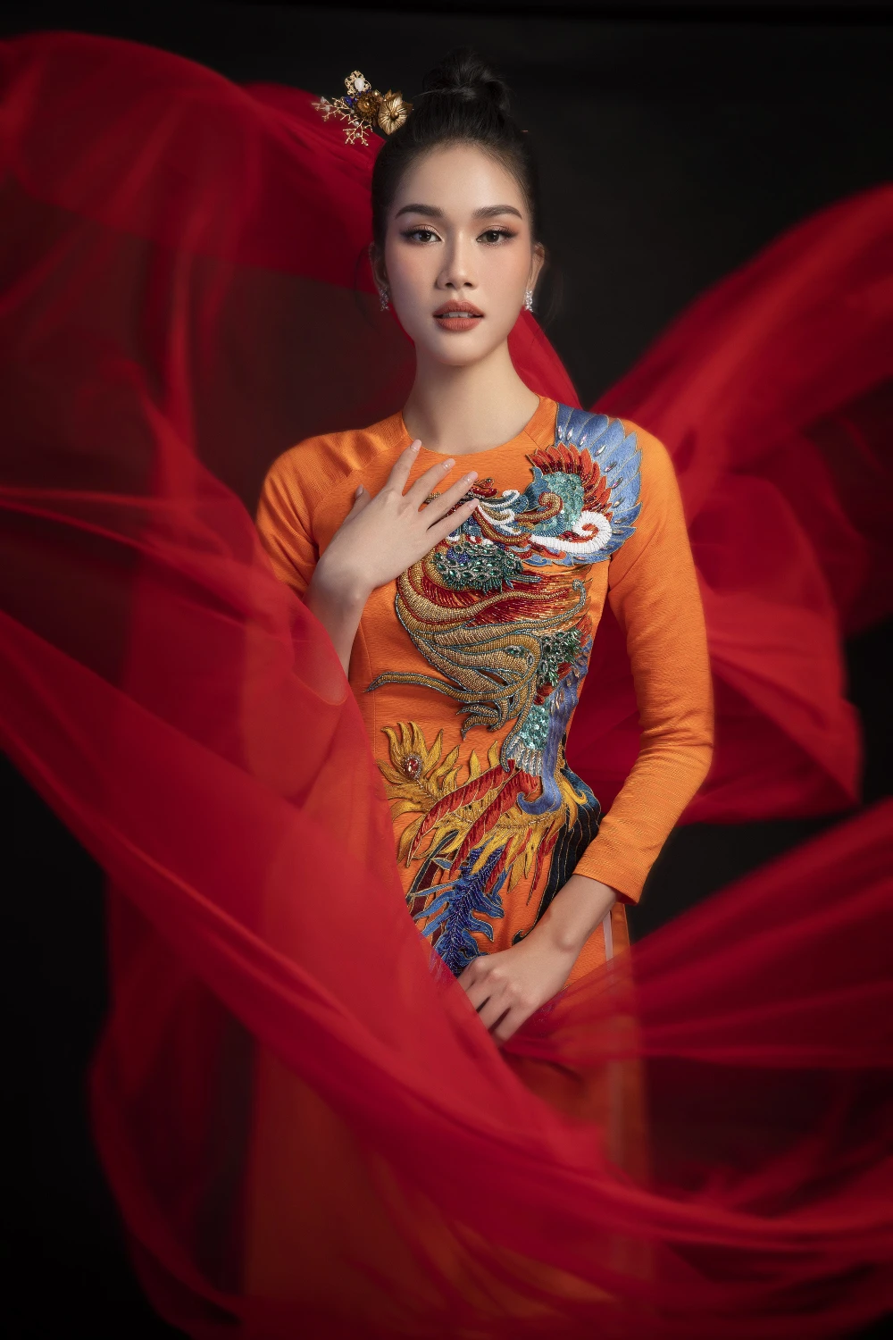 Chuyển sang bộ trang phục của nhà thiết kế Thủy Nguyễn, tốp 3 Hoa hậu Việt Nam 2020 lại khoe sắc đầy kiêu sa và tôn vinh vẻ đẹp nữ quyền. Với điểm nhấn là hoạ tiết rồng phượng cùng dải lụa bay phấp phới như ẩn dụ cho hình tượng một người phụ nữ truyền thống.