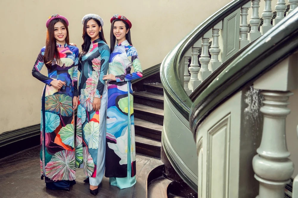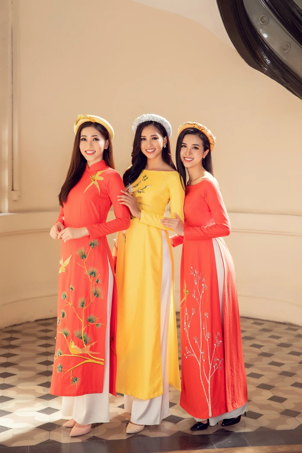 Tân Hoa hậu Trần Tiểu Vy, Á hậu 1 Bùi Phương Nga và Á hậu 2 Nguyễn Thị Thúy An lộng lẫy trong bộ áo dài Tết.
