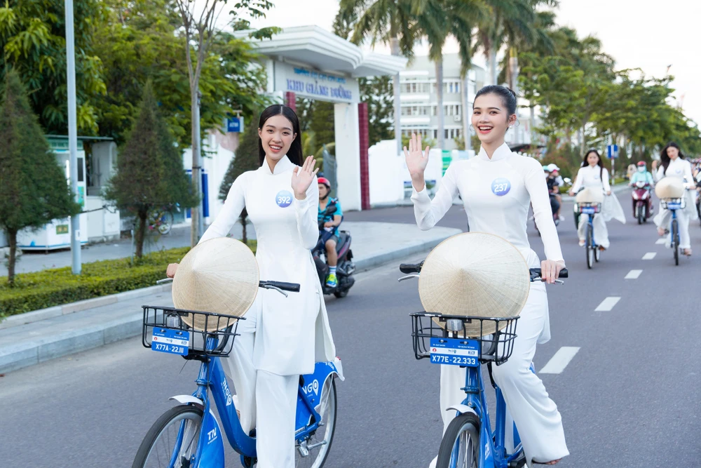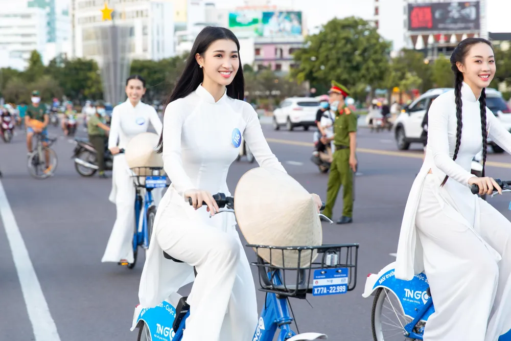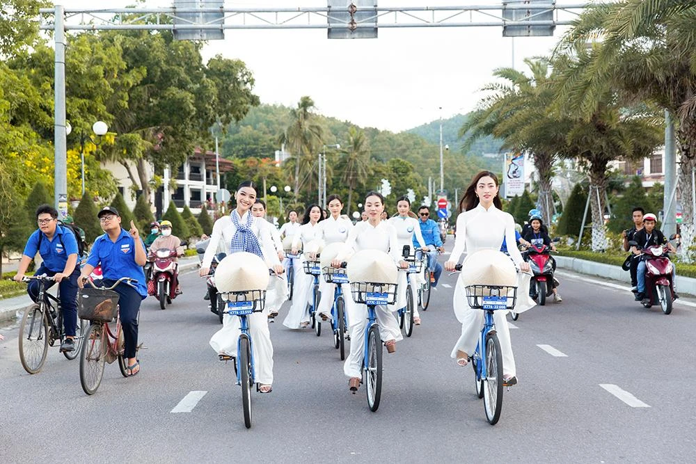 Hoa hậu Lương Thùy Linh cùng các thí sinh đạp xe dọc thành phố. |