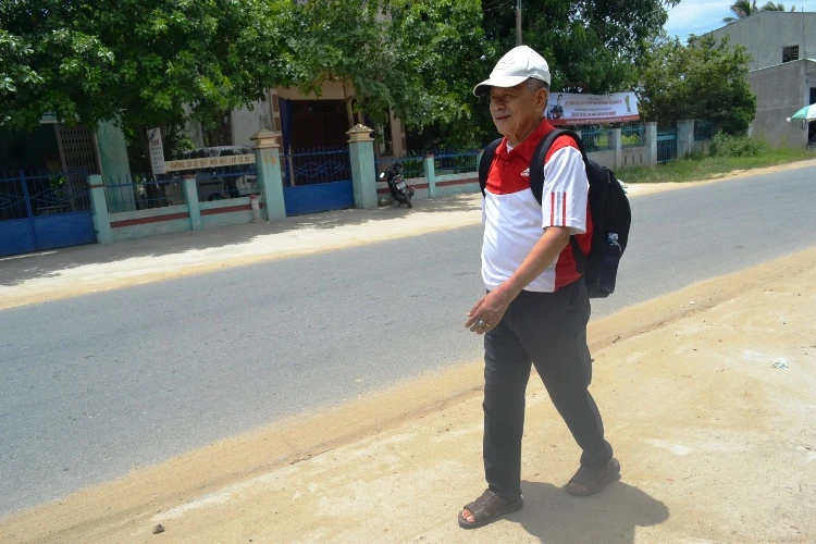 Mỗi ngày, cụ đều đi bộ ra trung tâm đón xe buýt ra Đà Nẵng học. Ảnh: TT