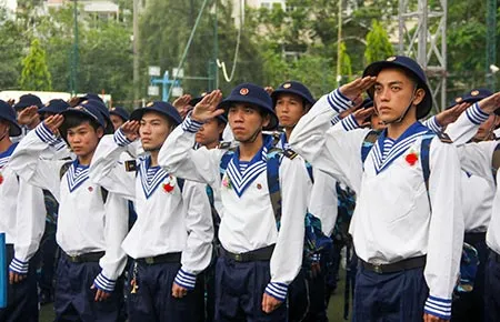 Các tân binh của lực lượng hải quân chào cờ Tổ quốc trước khi lên đường nhập ngũ. Ảnh: NGUYỄN HOÀNG