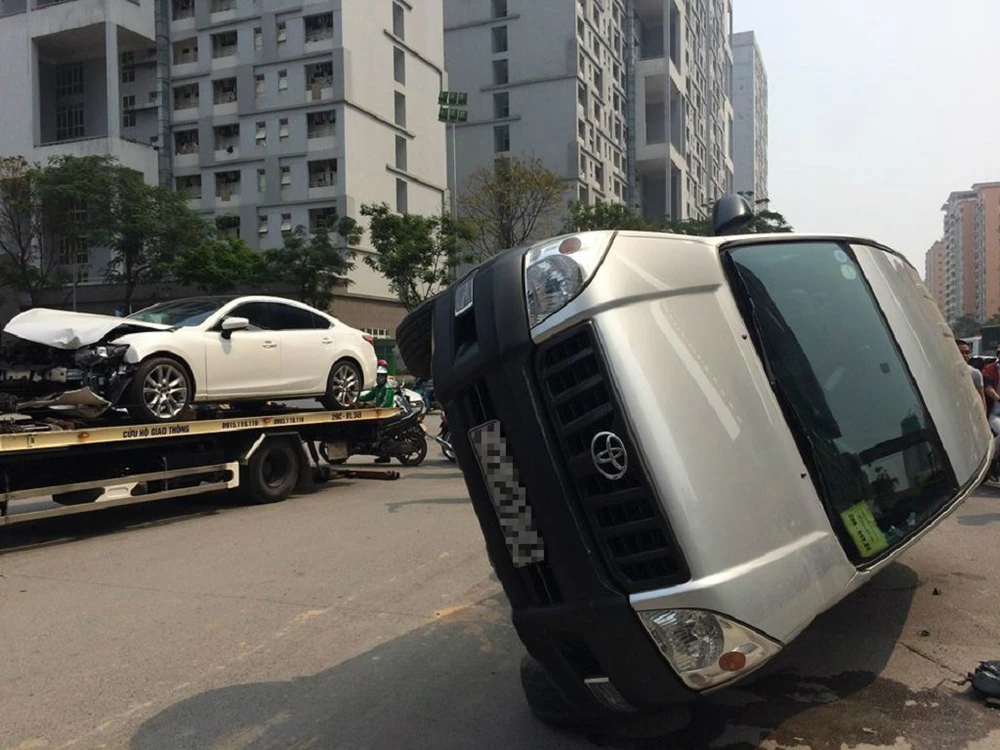 Hình ảnh tại hiện trường cho thấy vụ va chạm diễn ra giữa một ô tô nhãn hiệu Mazda 6 và một chiếc Toyota loại 7 chỗ, cả hai đều mang biển số Hà Nội. Sau cú tông, chiếc xe bảy chỗ bị lật nghiêng giữa đường, trong khi đó phần đầu của chiếc Mazda 6 bị biến dạng.