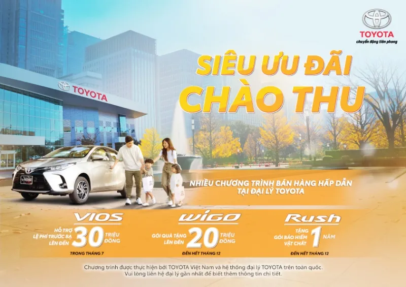 Bên cạnh Wigo, chương trình “siêu ưu đãi mùa thu” còn áp dụng với mẫu xe Vios và Rush. Cụ thể: hỗ trợ lệ phí trước bạ lên đến 30 triệu đồng cho khách hàng mua xe Vios G CVT từ ngày 1-7 đến hết ngày 31-7-2021. Với Vios E CVT và E MT sẽ nhận mức hỗ trợ 20 triệu đồng. Bên cạnh đó, trong thời gian trên, Công ty Tài Chính Toyota Việt Nam hỗ trợ khách hàng mua xe Vios với lãi suất ưu đãi cố định trong 6 tháng đầu chỉ 2,99%/năm. Nghĩa là, bạn chỉ cần số tiền thanh toán ban đầu từ 95 triệu đồng và số tiền thanh toán hàng tháng từ 4 triệu đồng (trong 6 tháng đầu), khách hàng đã có thể sở hữu xe Vios.