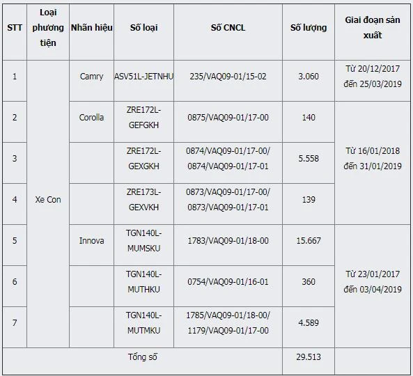 Số lượng xe bị triệu hồi cụ thể như sau: