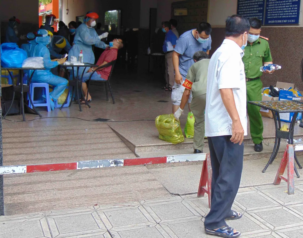 Cư dân block B, chung cư Thái An 2 bị phong tỏa và được xét nghiệm. Ảnh: TRẦN NGỌC