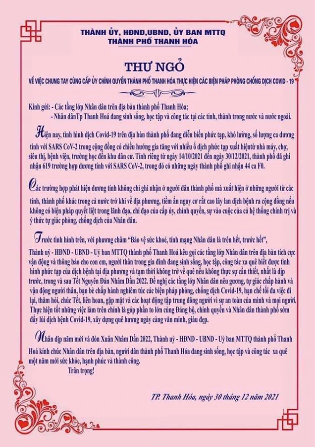Thư ngỏ thống kê từ ngày 14-10-2021 đến 30-12-2021 thành phố đã ghi nhận 619 ca dương tính với COVID-19. Vì thế TP Thanh Hóa có thư kêu gọi các tầng lớp nhân dân trên địa bàn tích cực vận động con em, người thân trong gia đình đang sinh sống, công tác xa quê biết được tình hình COVID-19 trên địa bàn.