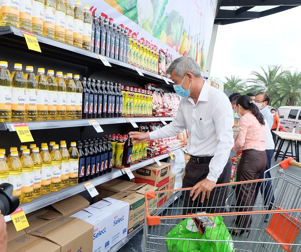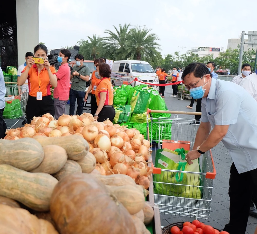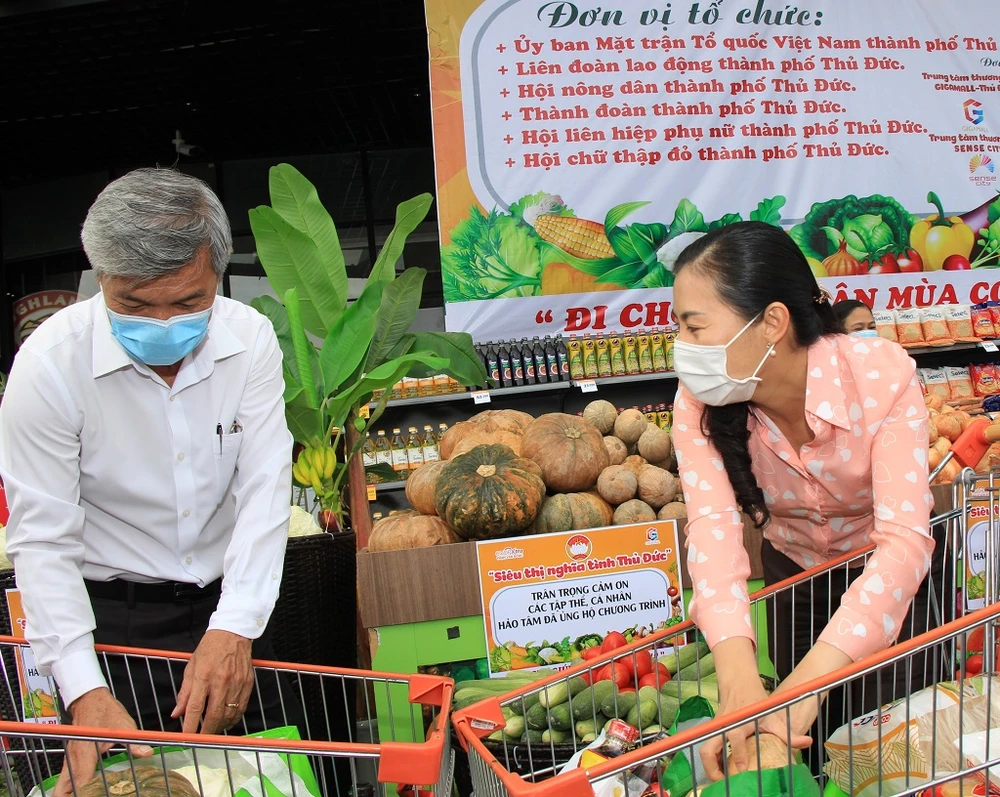 Nhiều mặt hàng được bày ở siêu thị nghĩa tình TP Thủ Đức. Trong ảnh: ông Trần Hữu Phước, Chủ tịch Ủy ban MTTQ Việt Nam TP Thủ Đức đi chợ giúp dân. Ảnh: T.T