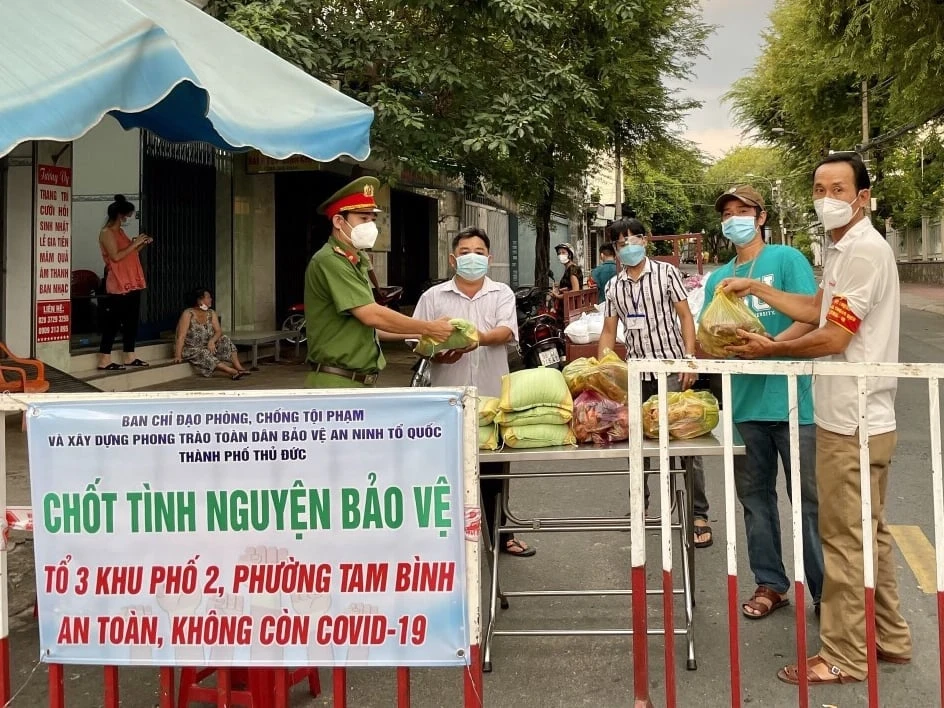 Về chăm sóc đời sống người dân, Công an 34 Phường tại TP Thủ Đức đã phối hợp cùng các ban ngành, đoàn thể hỗ trợ lương thực, thực phẩm chăm lo đời sống an sinh xã hội cho người dân yên tâm ở lại, để “không để ai bị đói, bị khát”, “ai ở đâu ở đó”.