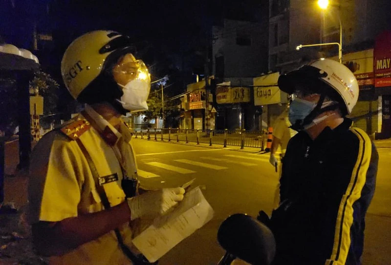 Người dân ra đường sau 18 giờ bị lực lượng Công an TP Thủ Đức xử lý vi phạm. Ảnh: TS
