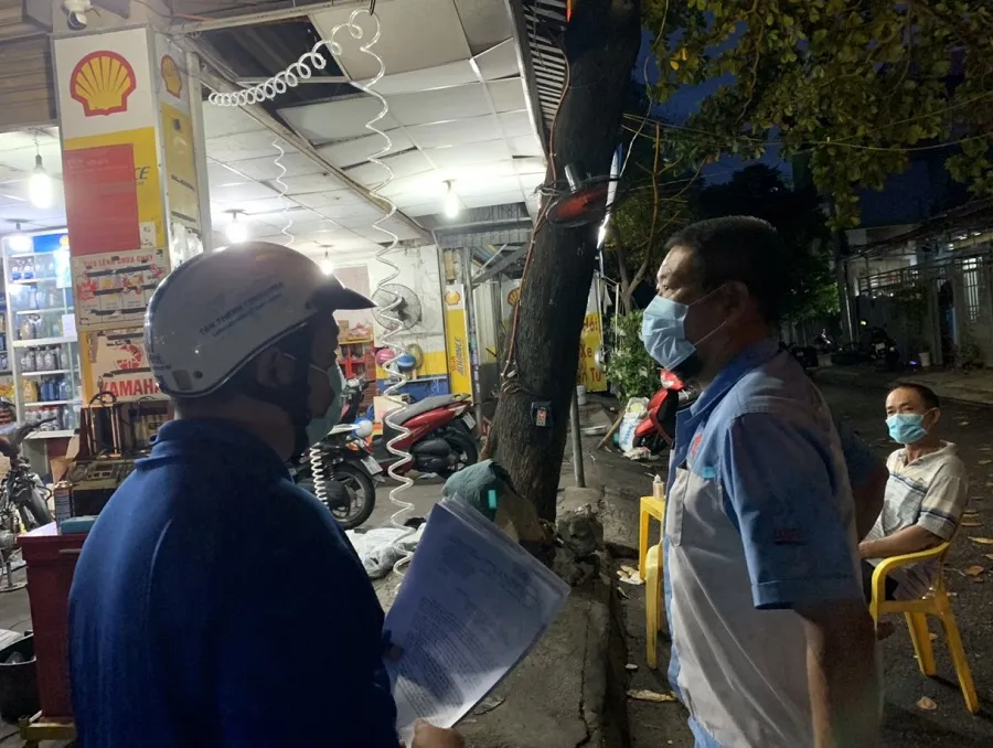 Cán bộ phường Linh Tây, TP Thủ Đức, TP.HCM kiểm tra, nhắc nhở một cửa hàng kinh doanh phụ tùng xe máy ngay trước thời điểm thực hiện Chỉ thị 16. ẢNH: THANH TUYỀN