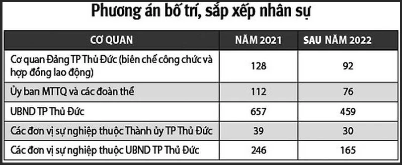 Đề án Chính phủ trình dự kiến sẽ bố trí ở TP Thủ Đức 822 cán bộ, công chức, viên chức và lao động hợp đồng. Số lượng cán bộ, công chức, viên chức và lao động dôi dư là 399 người. “TP.HCM đã có phương án bố trí, giải quyết cán bộ, công chức dôi dư bảo đảm lộ trình theo quy định” - đề án nêu rõ.