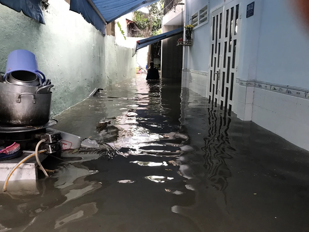 Trưa 21-5, cơn mưa đổ xuống trên địa bàn TP Thủ Đức, TP.HCM khiến một con hẻm 26B/2D, đường Tú Xương, phường Tăng Nhơn Phú B, TP Thủ Đức, TP.HCM ngập nặng. Năm hộ dân sống tại con hẻm này trở tay không kịp vì nước tràn vào nhà bất ngờ, nhiều đồ dùng trong gia đình như tủ lạnh, xe máy, tivi trôi lềnh bềnh giữa dòng nước.