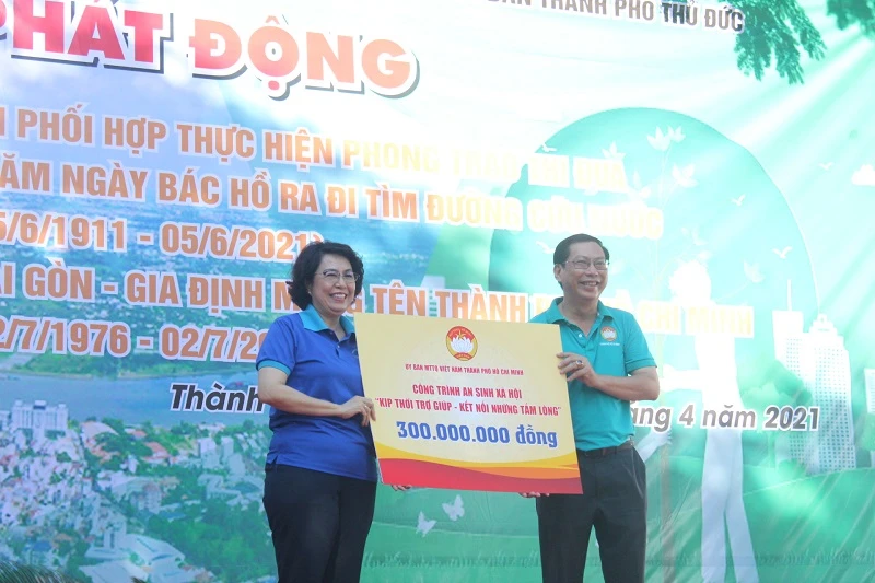 Ủy ban MTTQ Việt Nam TP.HCM tặng Ủy ban MTTQ TP Thủ Đức 300 triệu đồng để chăm lo công tác an sinh xã hội. ẢNH: T.T