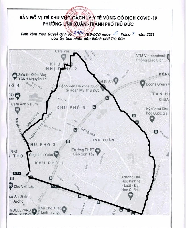 Phạm vi phong tỏa phường Linh Xuân. Ảnh: UBND TP Thủ Đức