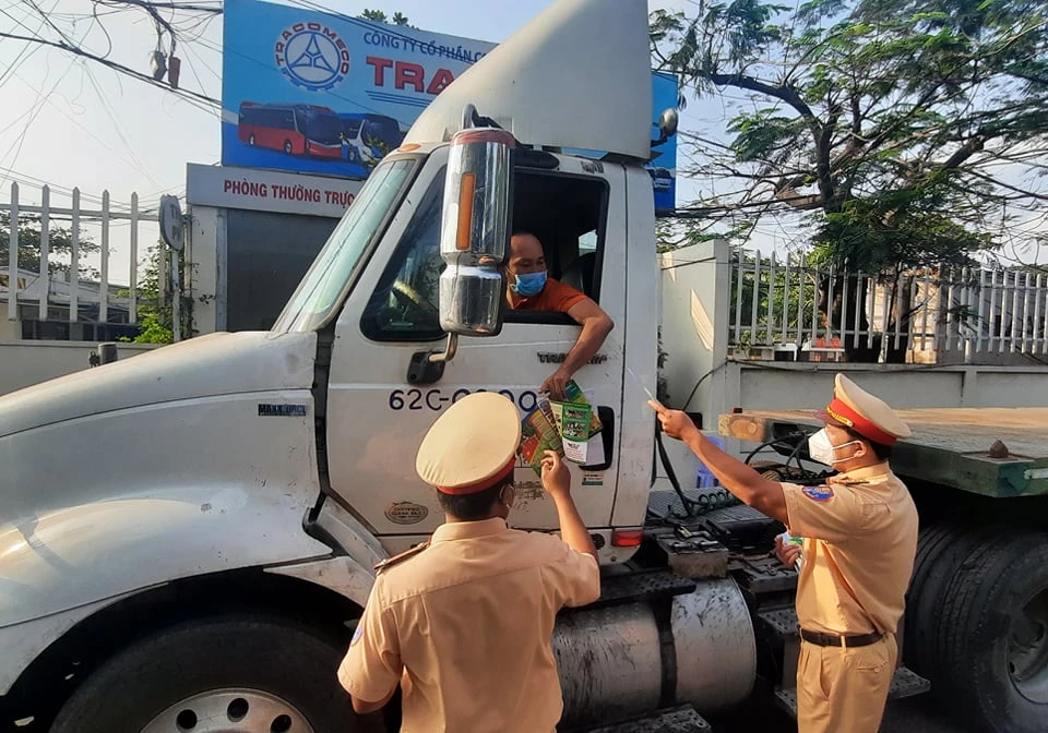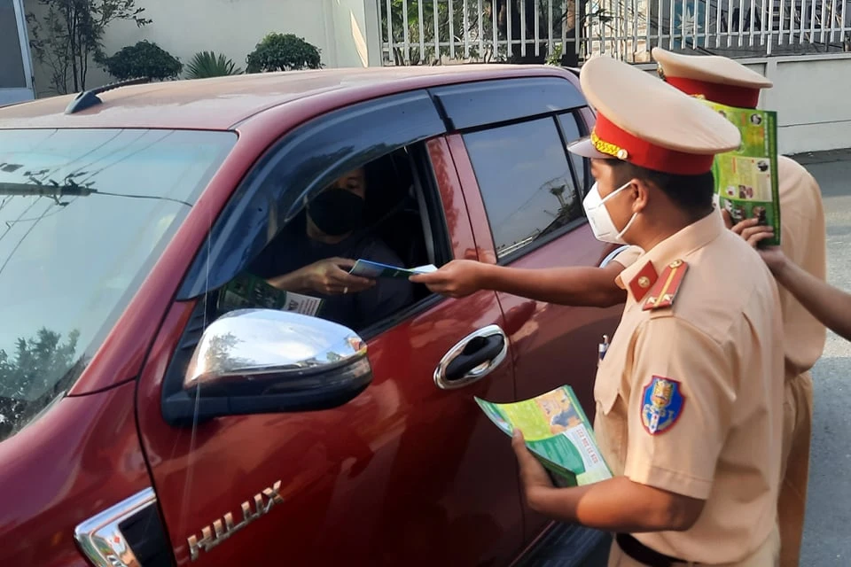 Công an TP Thủ Đức phát tờ rơi tuyên truyên cho các tài xế thực hiện các biện pháp đảm bảo ATGT. Ảnh: TS
