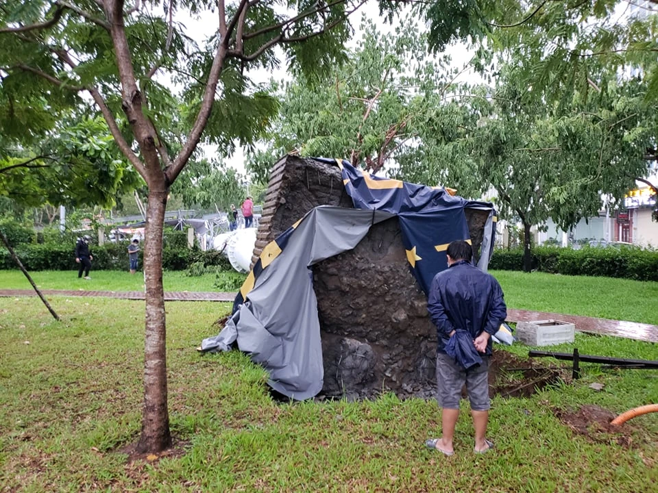 Móng trụ biển quảng cáo bị bật lên trong cơn mưa. Ảnh: TS