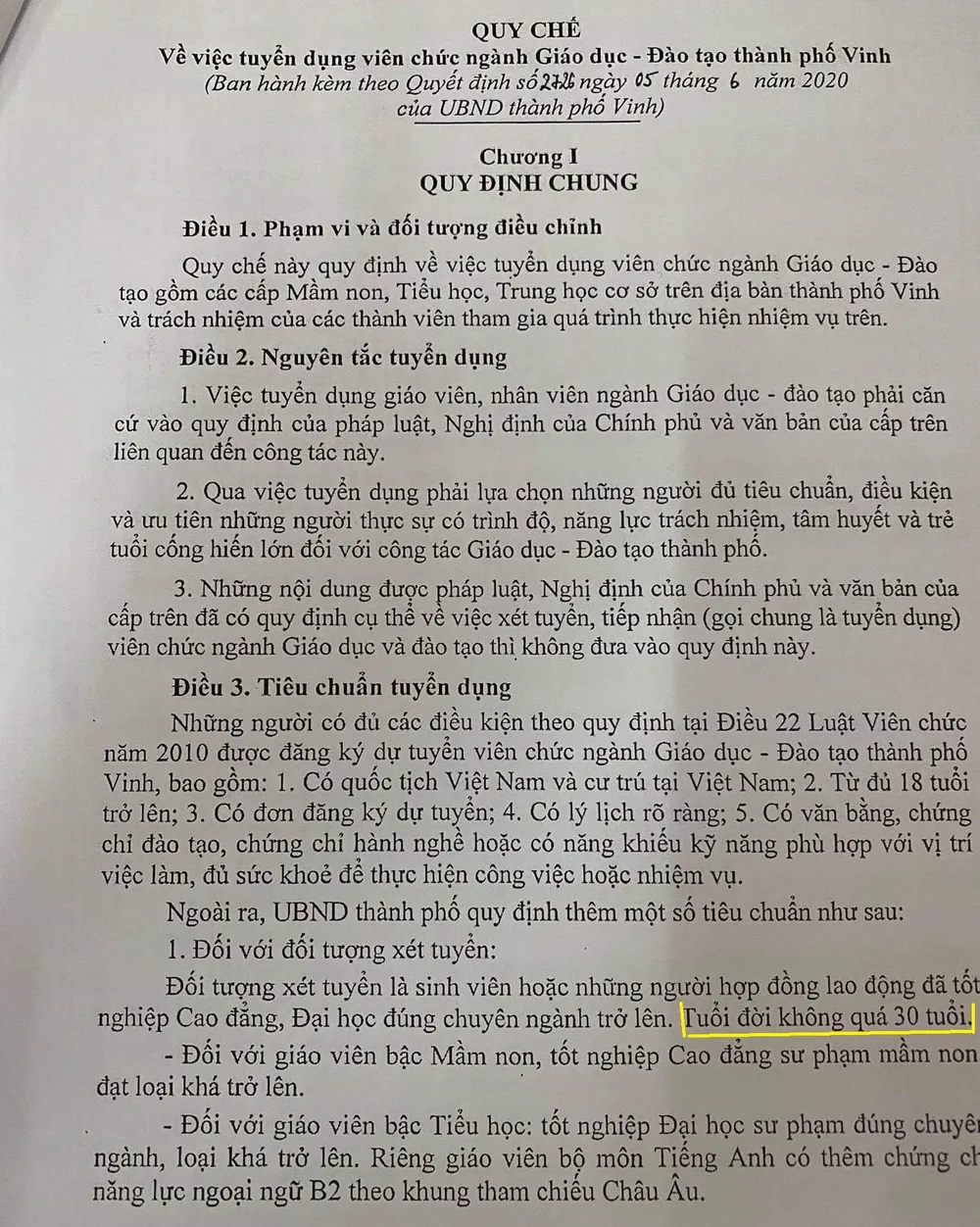 Ngoài tiêu chuẩn tuyển dụng chung, UBND TP Vinh quy định thêm một số tiêu chuẩn: “Đối với đối tượng xét tuyển: Đối tượng xét tuyển là sinh viên hoặc những người hợp đồng lao động đã tốt nghiệp CĐ, ĐH đúng chuyên ngành trở lên. Tuổi đời không quá 30 tuổi. Đối với giáo viên bậc Mầm non, tốt nghiệp CĐ sư phạm mầm non đạt loại khá trở lên.