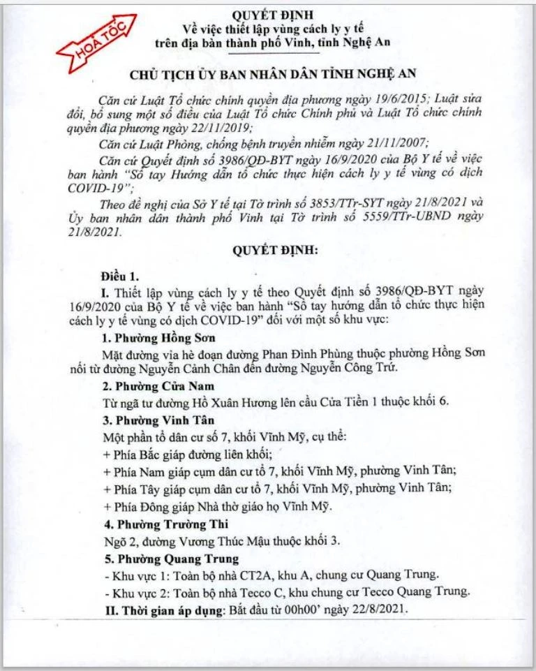 Ông Bùi Đình Long- Phó Chủ tịch UBND tỉnh Nghệ An vừa ký quyết định về việc thiết lập vùng cách ly y tế trên địa bàn TP Vinh