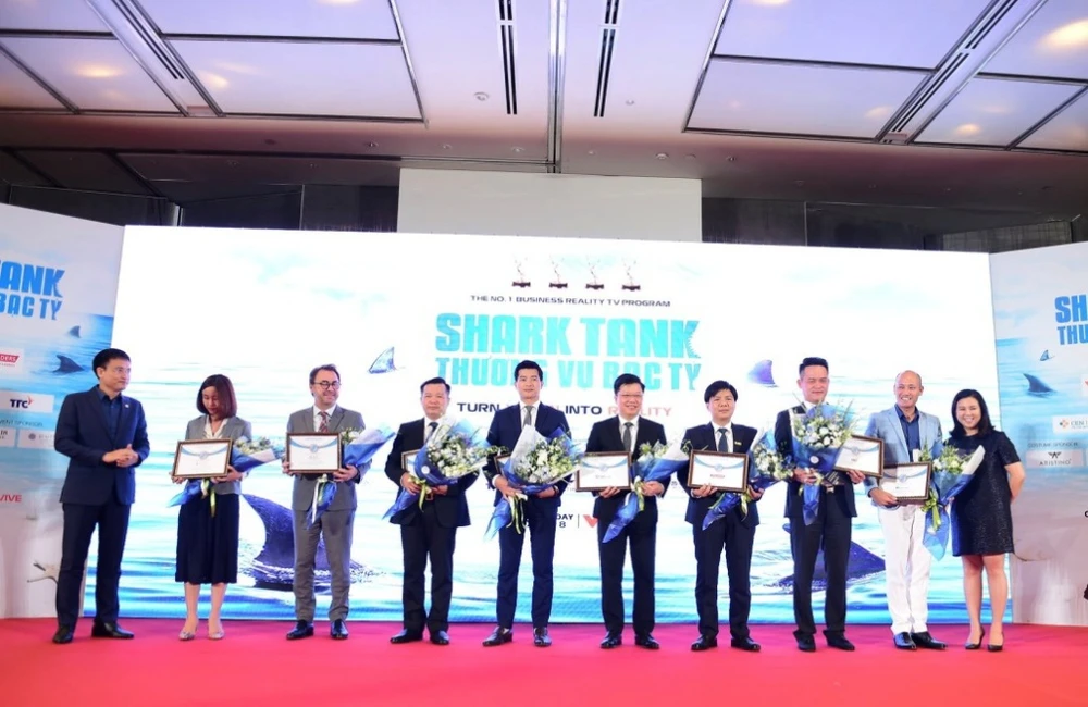 BTC Shark Tank tặng hoa và chụp hình lưu niệm cùng đại diện các nhà tài trợ trong họp báo ngày 5-6 tại TP.HCM.