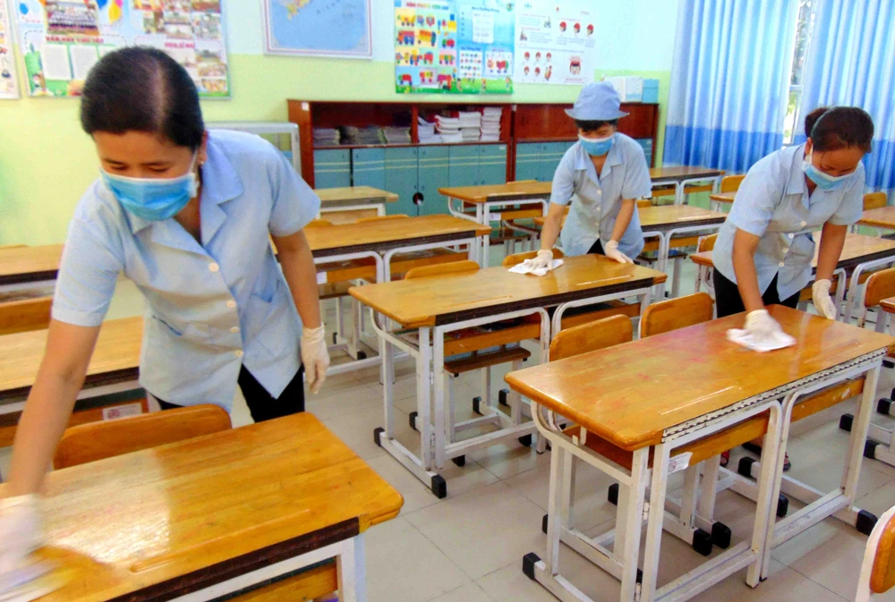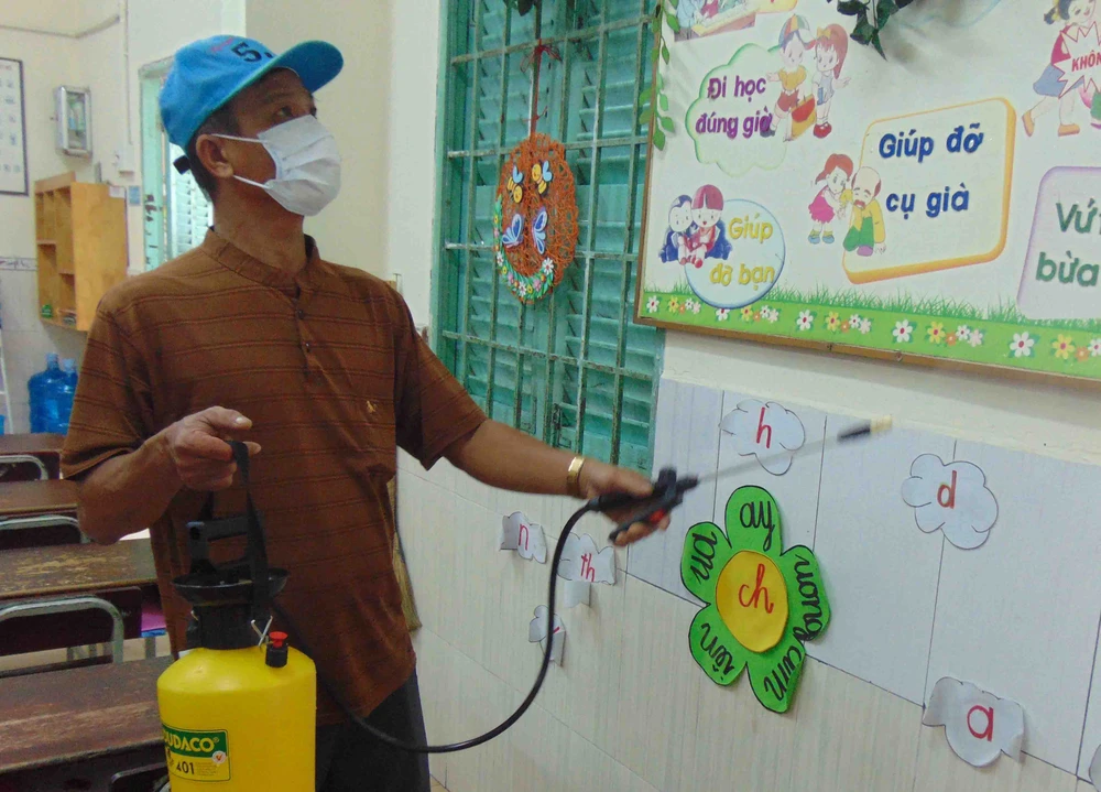 Theo bà Phượng, trường có 44 lớp học với hơn 2.000 HS và tất cả học bán trú. Trường đông HS nên rất dễ lây nhiễm bệnh nếu không phòng ngừa tốt. Do đó, trường tổ chức khử khuẩn, sát trùng tất cả phòng học và khuôn viên.