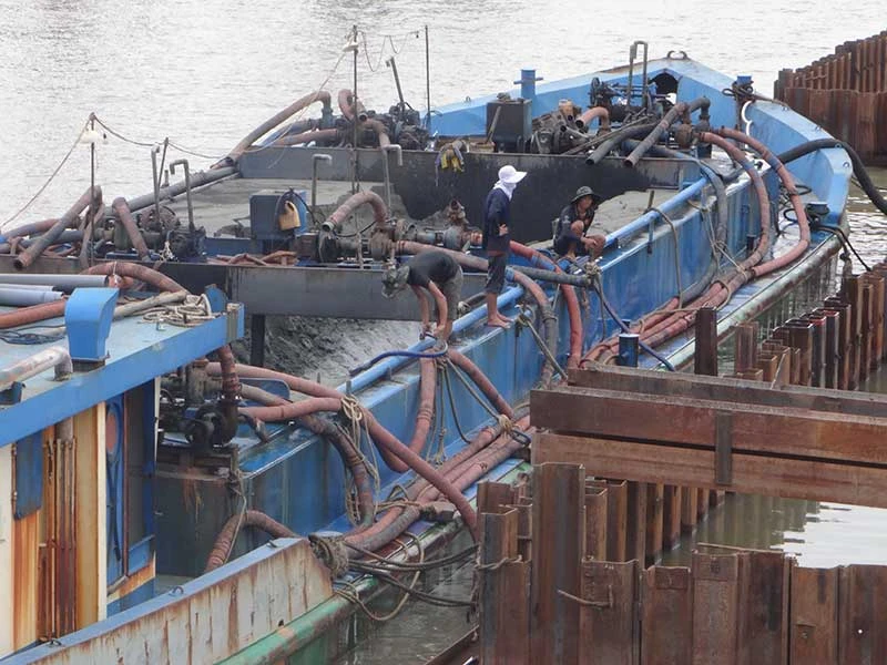 Bùn phát sinh từ công trình thi công cống ngăn triều Tân Thuận, một trong sáu công trình của dự án ngăn triều. Ảnh: KB