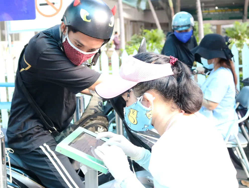Nhân viên y tế Bệnh viện Da liễu TP.HCM thực hiện khai báo y tế đối với người vào bệnh viện. Ảnh: TRẦN NGỌC