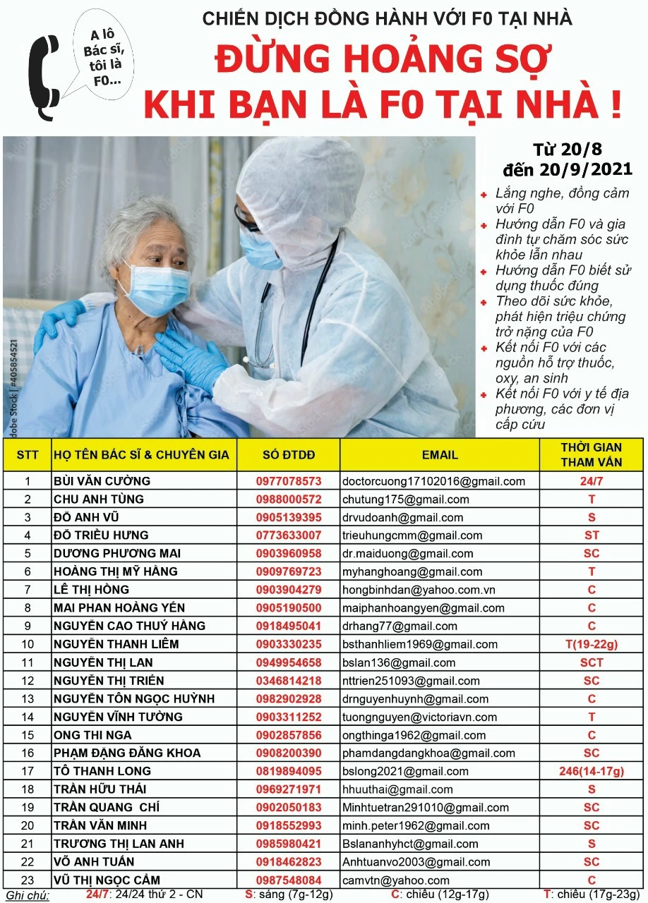Để hỗ trợ, đồng hành, giúp F0 giữ vững sức khỏe tinh thần và thể chất, một số bác sĩ và chuyên gia của Liên Chi hội Hành nghề Y Tư nhân TP.HCM đã phát động chiến dịch đồng hành cùng F0 với tên gọi “Đừng hoảng sợ khi bạn là F0 tại nhà” từ ngày 20-8 đến ngày 20-9.