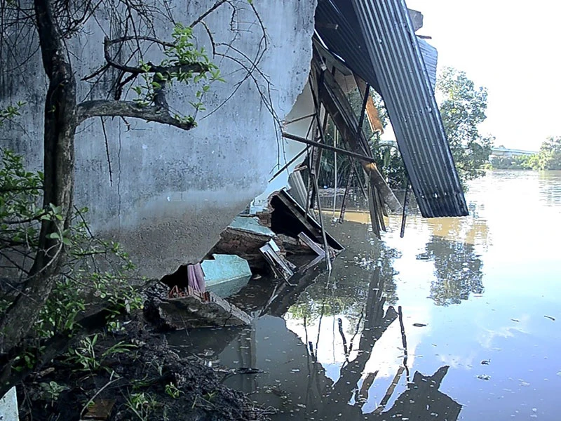 Theo quan sát bên trong, một phần của 5 căn nhà bất ngờ đổ sập xuống sông cùng nhiều đồ đạc, tài sản; nền nhà và tường bị nứt.; 3 căn nhà gần đó bị ảnh hưởng. Chính quyền địa phương sau đó có mặt tại hiện trường chỉ đạo công tác xử lý, khắc phục.