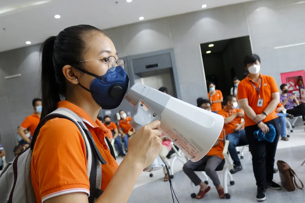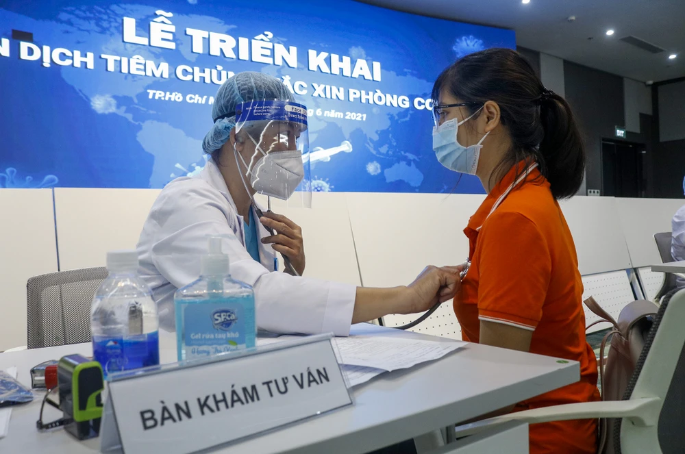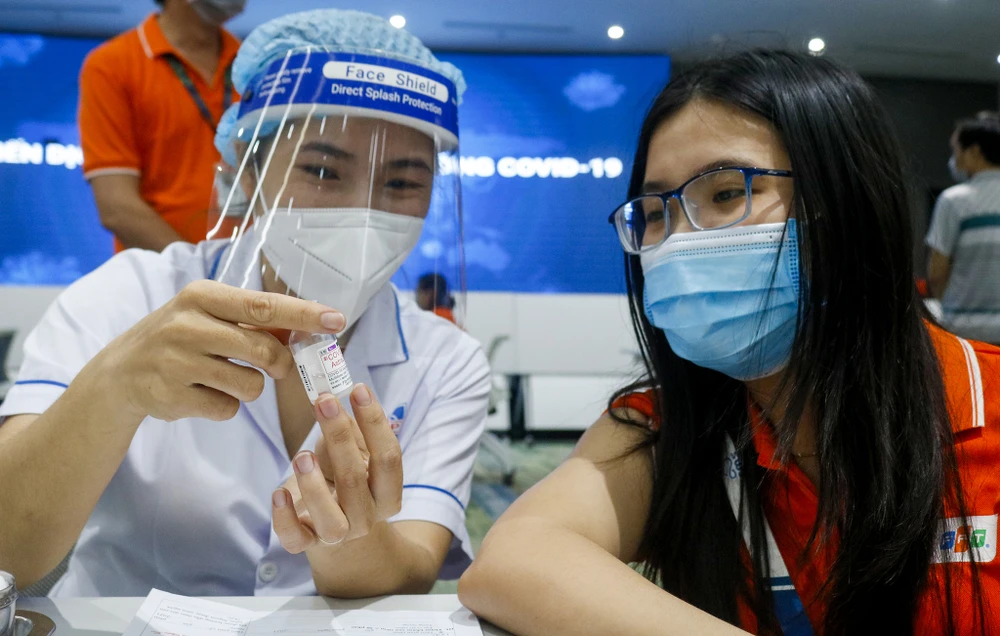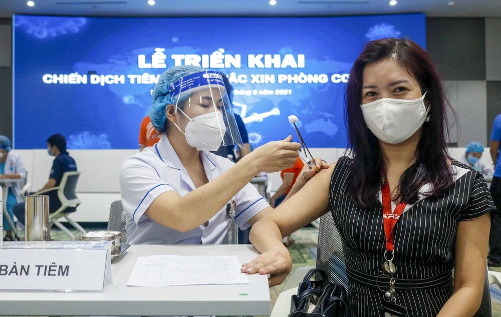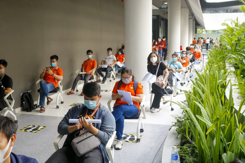 Từ 8 giờ ngày 19-6, 500 nhân viên công ty FPT Software tại Khu công nghệ cao TP.HCM ngồi xếp hàng để tiêm vaccine phòng COVID-19. Đây là cột mốc mở đầu cho đợt tiêm 836.000 liều vaccine mà TP.HCM vừa được phân bố.