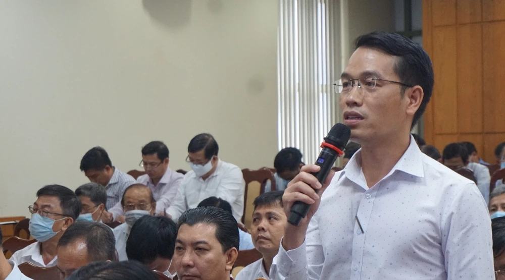 Ông Nguyễn Minh, Hiệu trưởng trường THPT chuyên Trần Đại Nghĩa phát biểu tại hội nghị. Ảnh: NQ