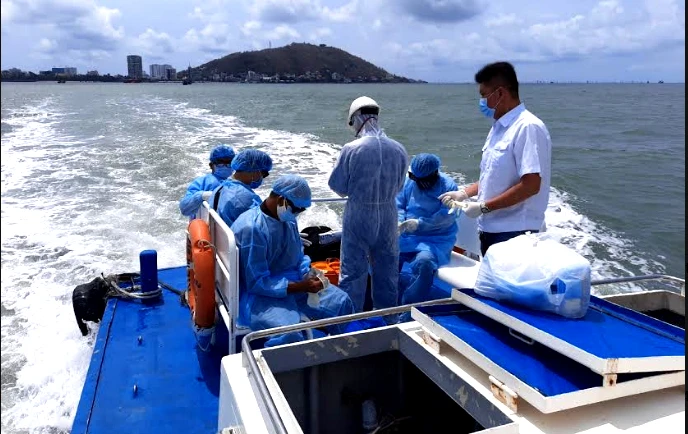 Nhân viên y tế ra tàu nước ngoài lấy mẫu thủy thủ xét nghiệm. Ảnh: HT