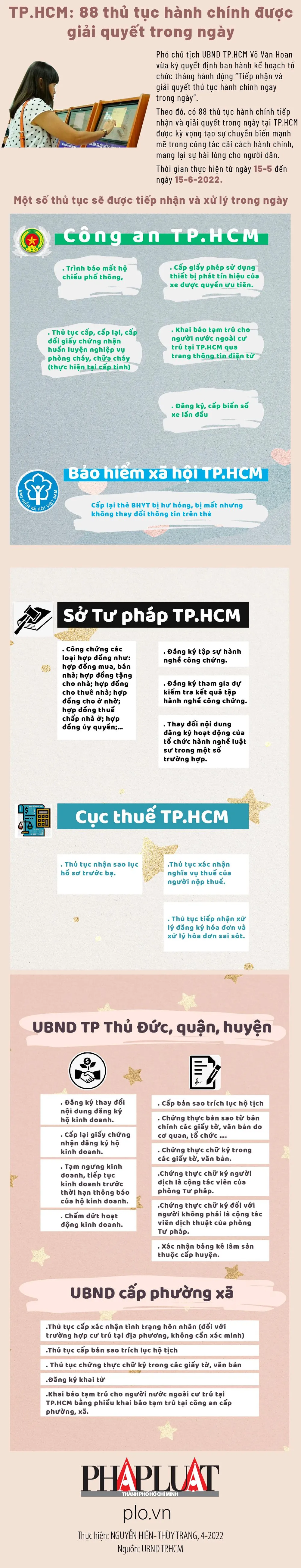 (PLO)- Từ ngày 15-5 đến 15-6, TP.HCM tổ chức tháng hành động “Tiếp nhận và giải quyết thủ tục hành chính ngay trong ngày”, có 88 thủ tục khi tiếp nhận sẽ được giải quyết ngay.