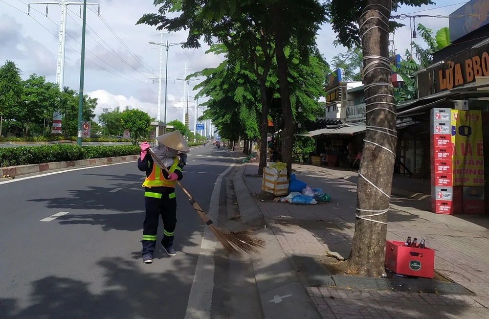 Ít người qua lại, việc dọn dẹp vệ sinh của công nhân môi trường tại đường Phạm Văn Đồng (TP Thủ Đức) trở nên dễ dàng hơn. Ảnh: KHÁNH CHI