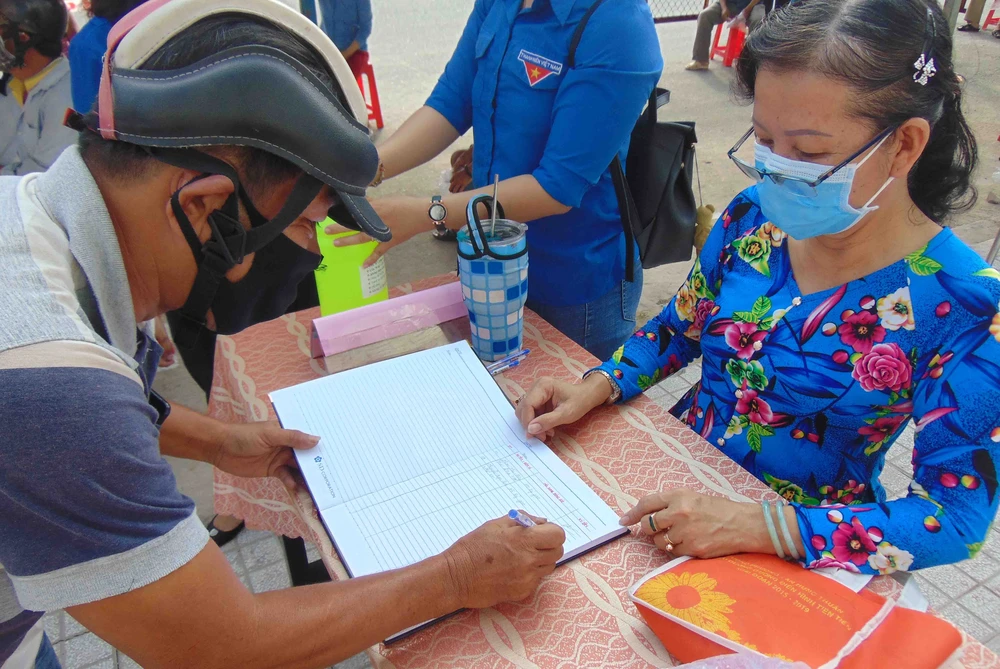Ông Tịnh (56 tuổi) ký tên đóng góp 25 kg gạo giúp bà con nghèo. Ảnh: TRẦN NGỌC