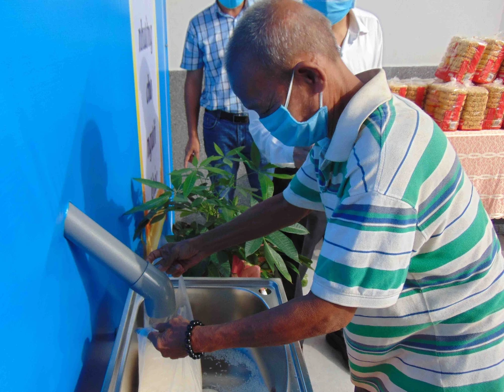 Ông Hai (65 tuổi) đang nhận gạo từ ATM gạo. Ảnh: TRẦN NGỌC