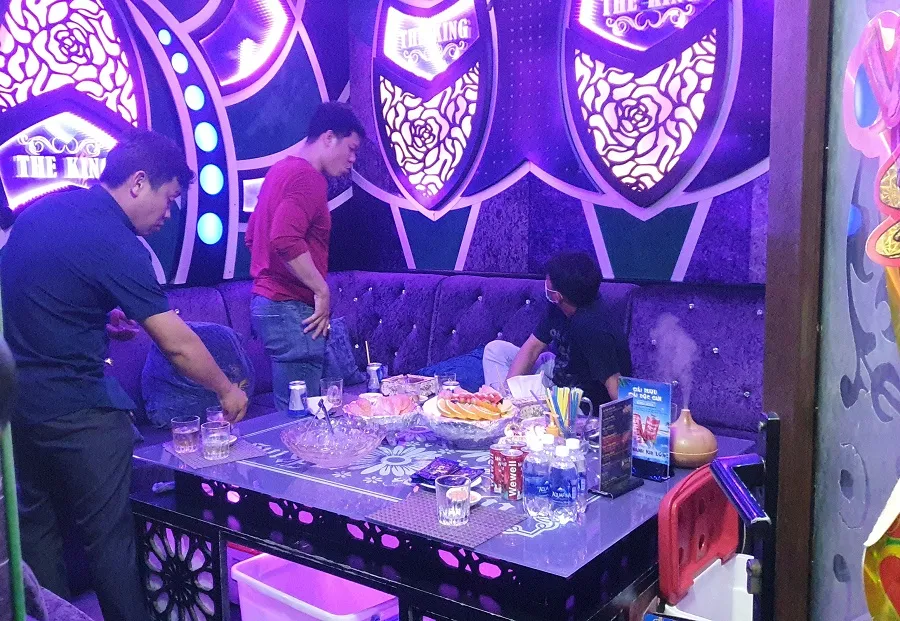 Một phòng hát karaoke đang hoạt động khi đoàn kiểm tra vào. Ảnh: NGUYỄN YÊN