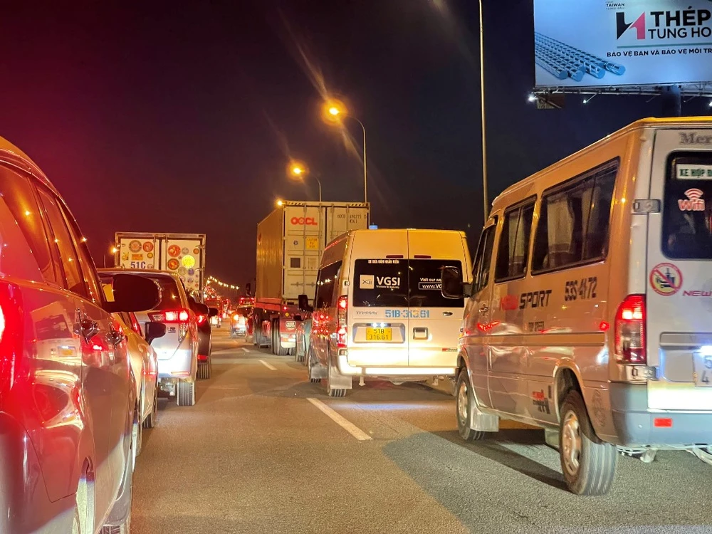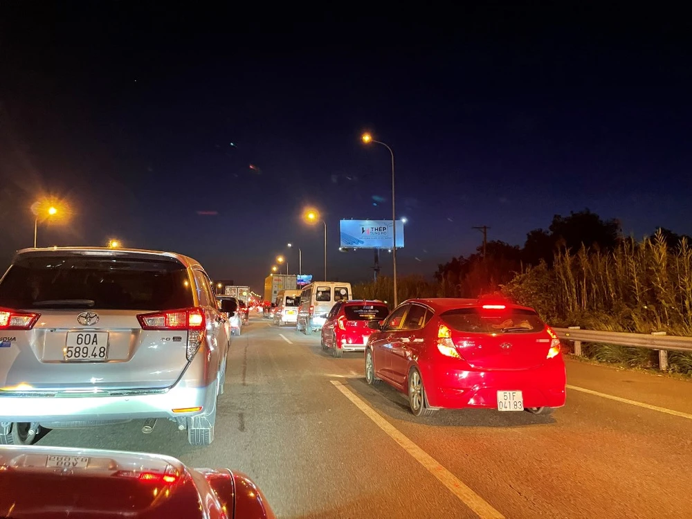 Đến 19 giờ, đoạn cầu Long Thành đến trạm thu phí Long Phước xảy ra tình trạng kẹt xe do một xe container chết máy giữa cầu Long Thành.
