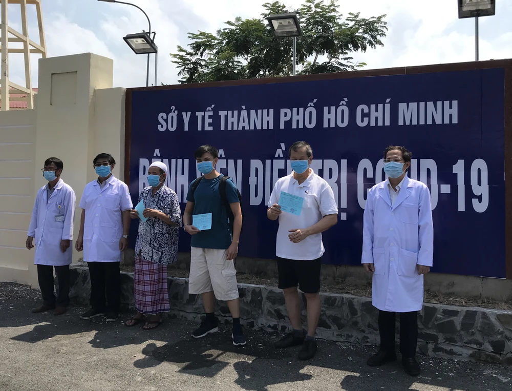 Ba bệnh nhân 100, 99, 121 điều trị tại Bệnh viện điều trị COVID-19 khỏi bệnh và tiếp tục cách ly tại nhà 14 ngày. Ảnh: BVCC