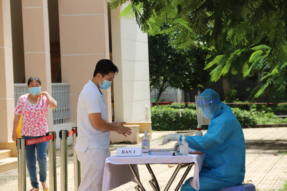 Trước khi nhận lá phiếu, cử tri phải sát khuẩn tay.
