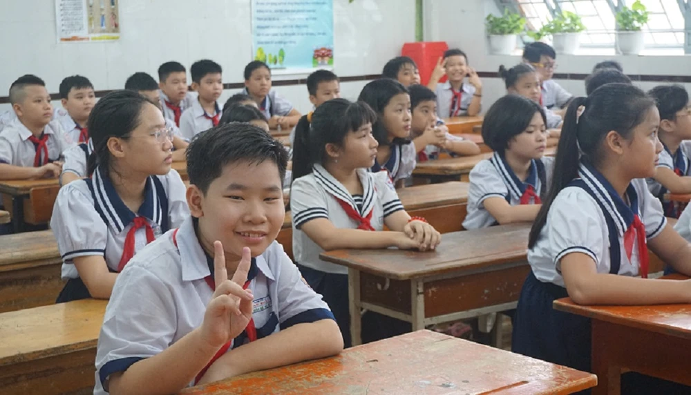 Học sinh lớp 5 Trường Tiểu học An Hội, quận Gò Vấp hào hứng khi được quay trở lại trường sau thời gian dài nghỉ học tránh dịch. Ảnh: NQ