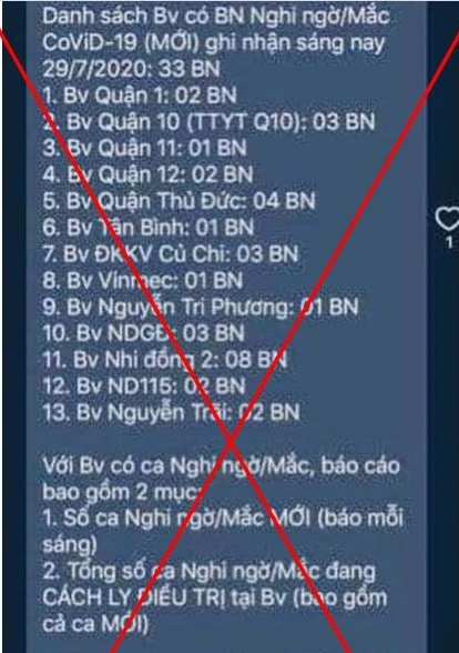 Mới đây, mạng xã hội xuất hiện thông tin “Danh sách bệnh viện (BV) có bệnh nhân nghi ngờ/mắc COVID-19 (mới) ghi nhận sáng nay 29-7: 33 bệnh nhân”.