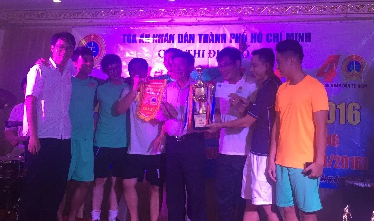 Phó chánh án TAND TP.HCM Nguyễn Văn Châu trao giải cho đội vô địch bóng đá