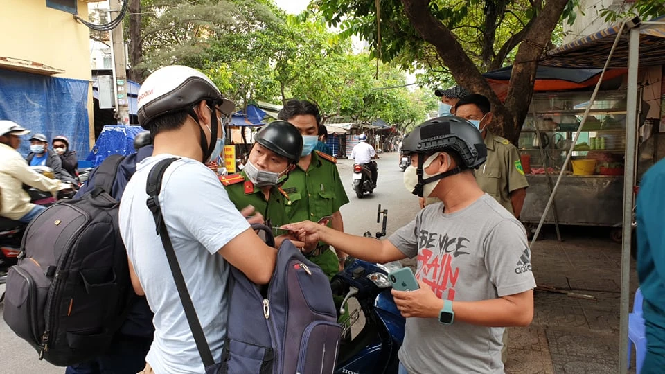 Cơ quan chức năng kiểm tra giấy tờ của nhà báo tác nghiệp tại khu vực chung cư Hòa Bình: Ảnh: NGUYỄN TÂN