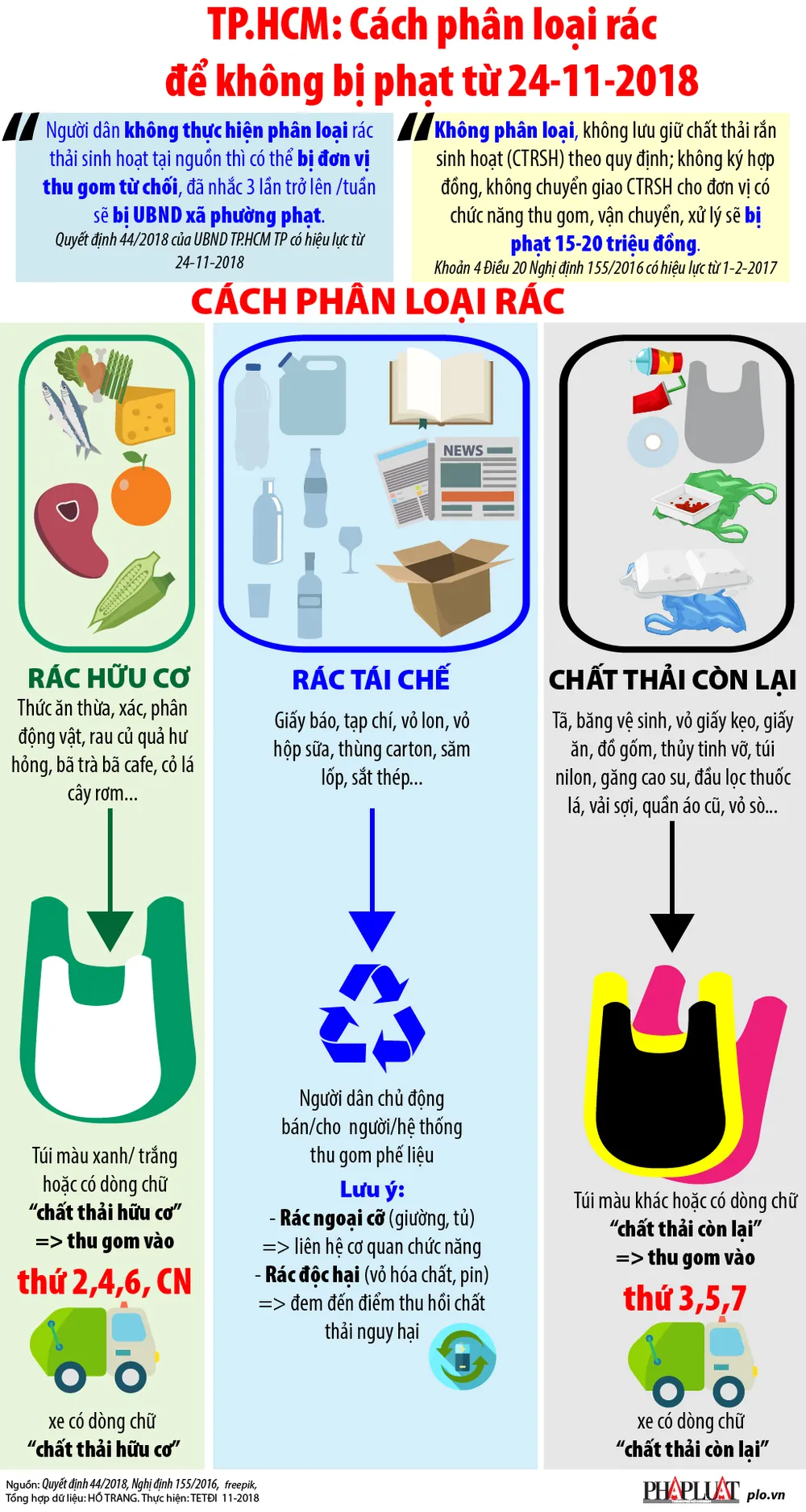 (PLO)- Từ ngày 24-11-2018, nếu người dân ở TP.HCM không tự phân loại rác trước khi vứt thì đơn vị thu gom có quyền từ chối tiếp nhận rác. Dưới đây là hướng dẫn cụ thể cách phân loại rác theo Quyết định số 44/2018 của UBND TP.HCM vừa ban hành.