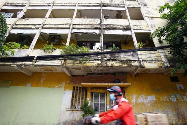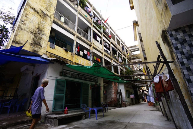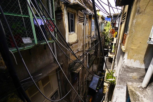 Chung cư gồm ba lô A, B, C nối thành hình chữ U. Phần tường cũ nát, rêu bám thành mảng loang lổ, dây điện chằng chịt khắp nơi.